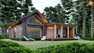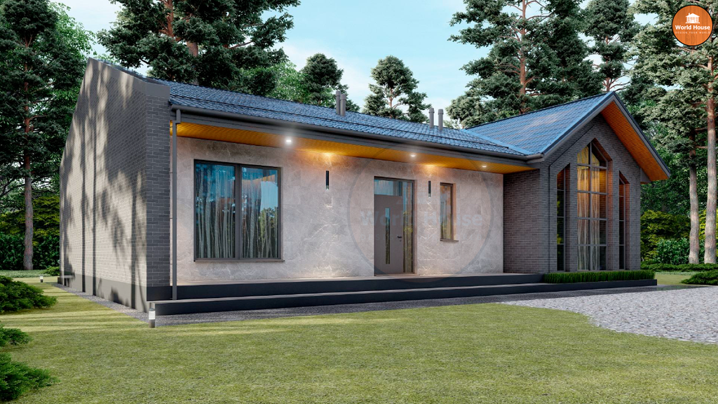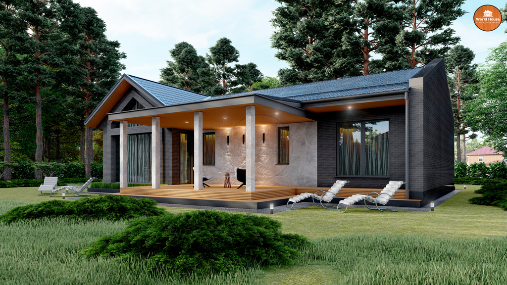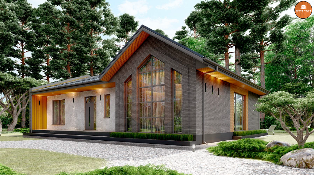— Современный фасад с сочетанием штукатурки, дерева и темного кирпича