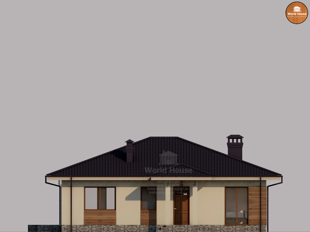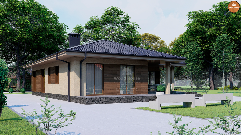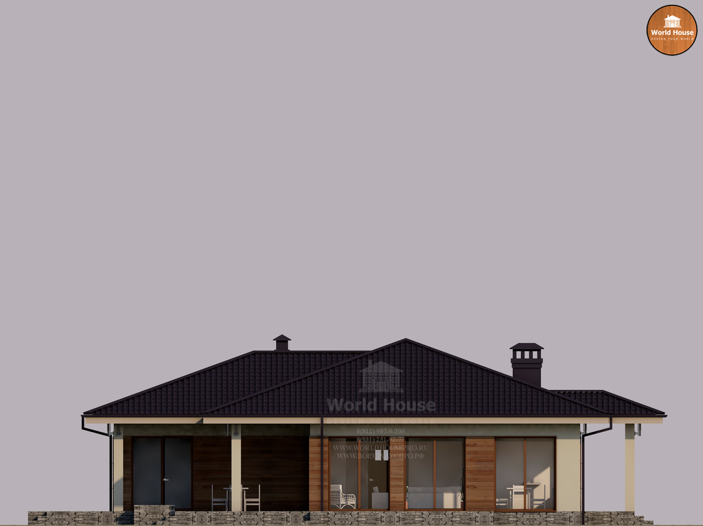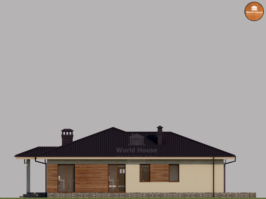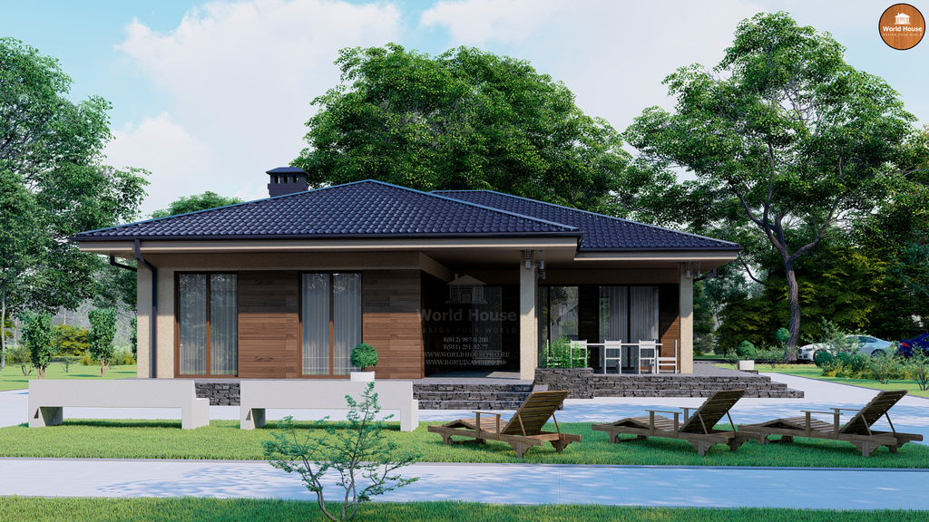 Одноэтажный приземистый домик с большими выносами кровли смотреться достаточно эффектно, не так ли ? В отделке фасада используются навесные панели под штукатурку и дерево! Много окон выполненных в пол на стороне террасы – что придаёт отличный акцент внешнему виду дома! Кровля из металочерепицы темно серого цвета перекликается с облицовкой цоколя что делает дом визуально достаточно широким и подчеркивает горизонтальные линии!