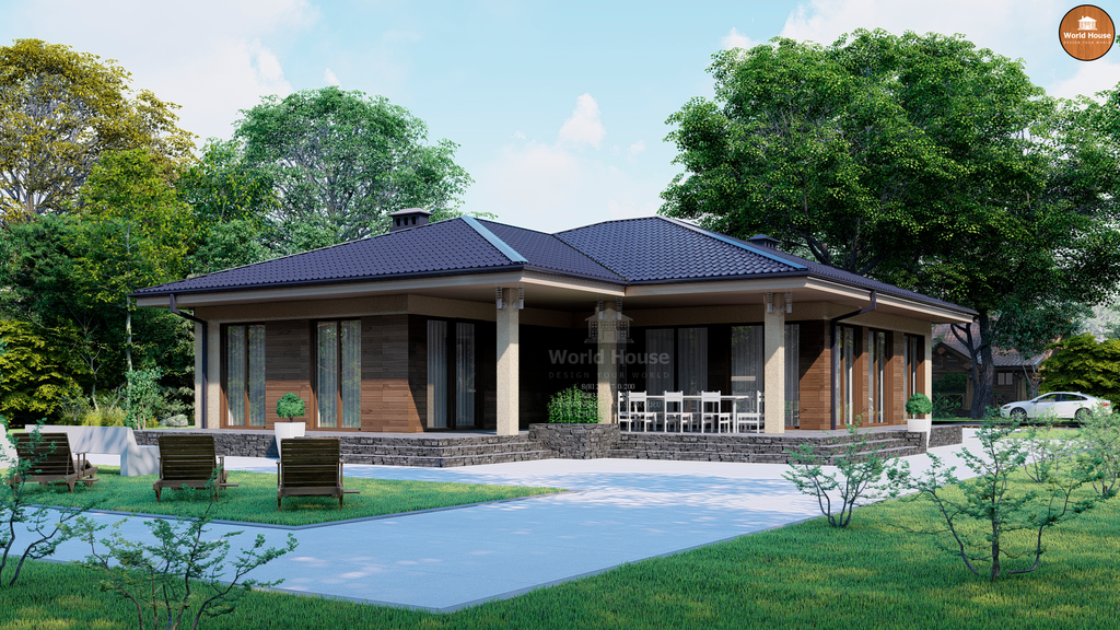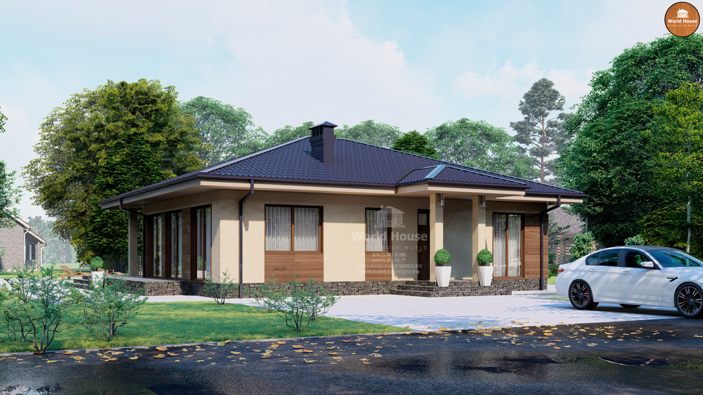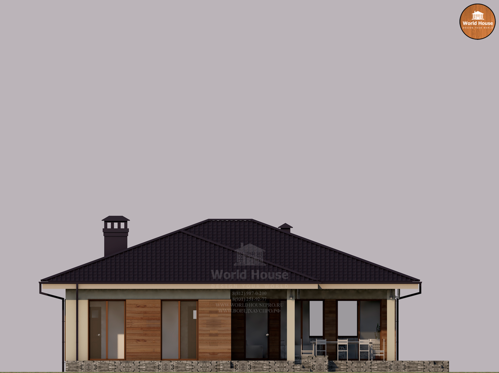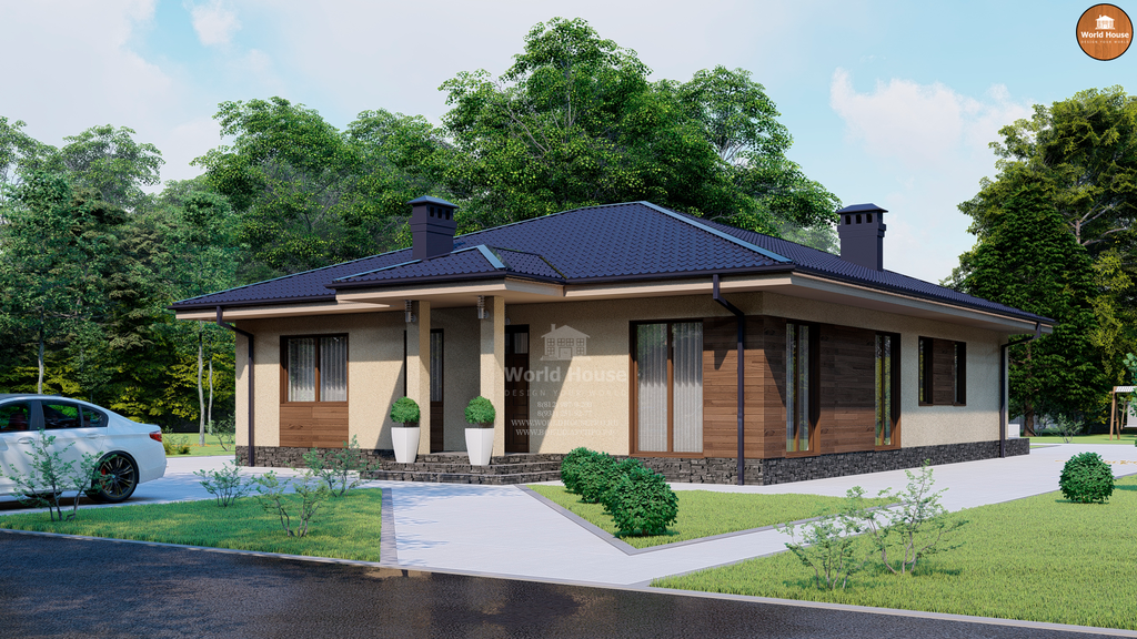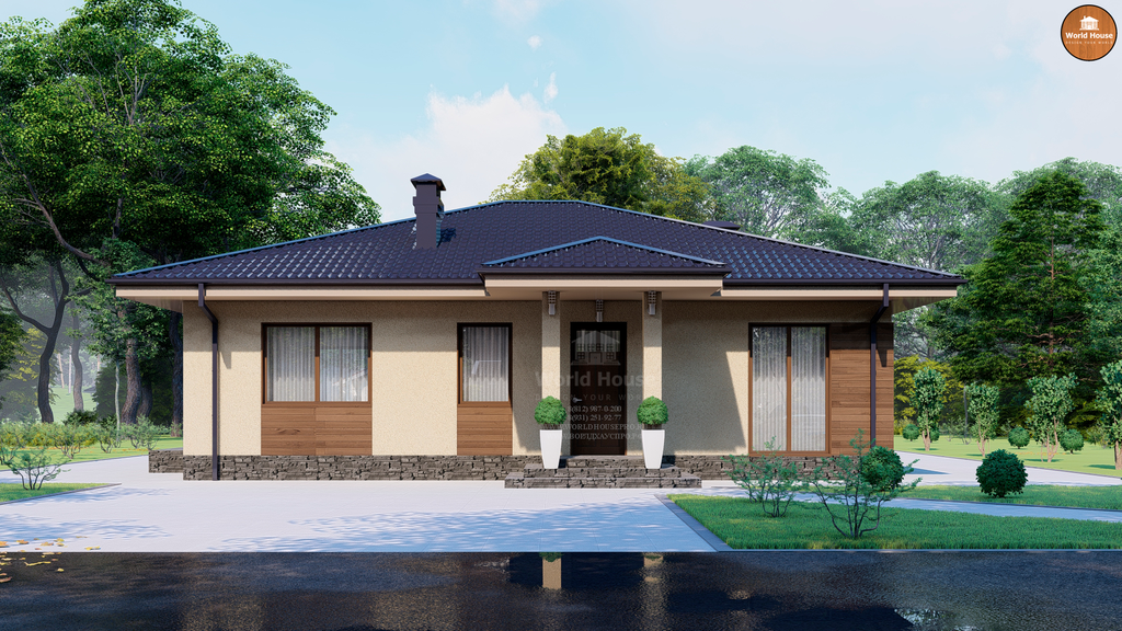 Одноэтажный приземистый домик с большими выносами кровли смотреться достаточно эффектно, не так ли ? В отделке фасада используются навесные панели под штукатурку и дерево! Много окон выполненных в пол на стороне террасы – что придаёт отличный акцент внешнему виду дома! Кровля из металочерепицы темно серого цвета перекликается с облицовкой цоколя что делает дом визуально достаточно широким и подчеркивает горизонтальные линии!