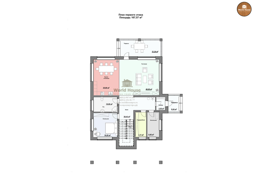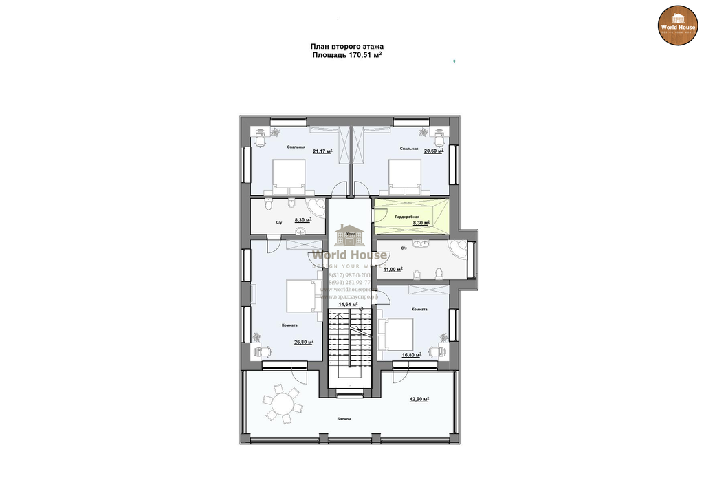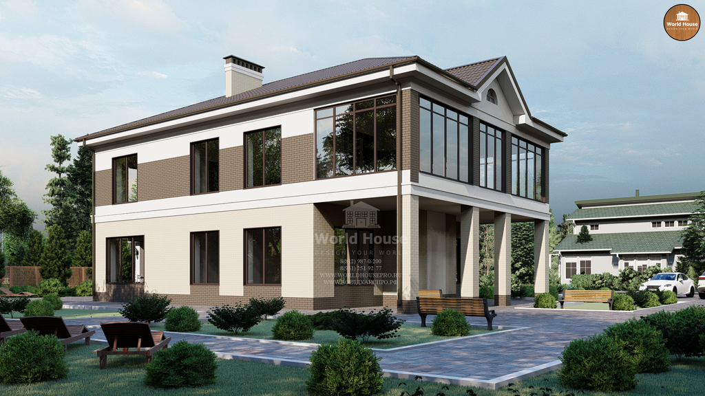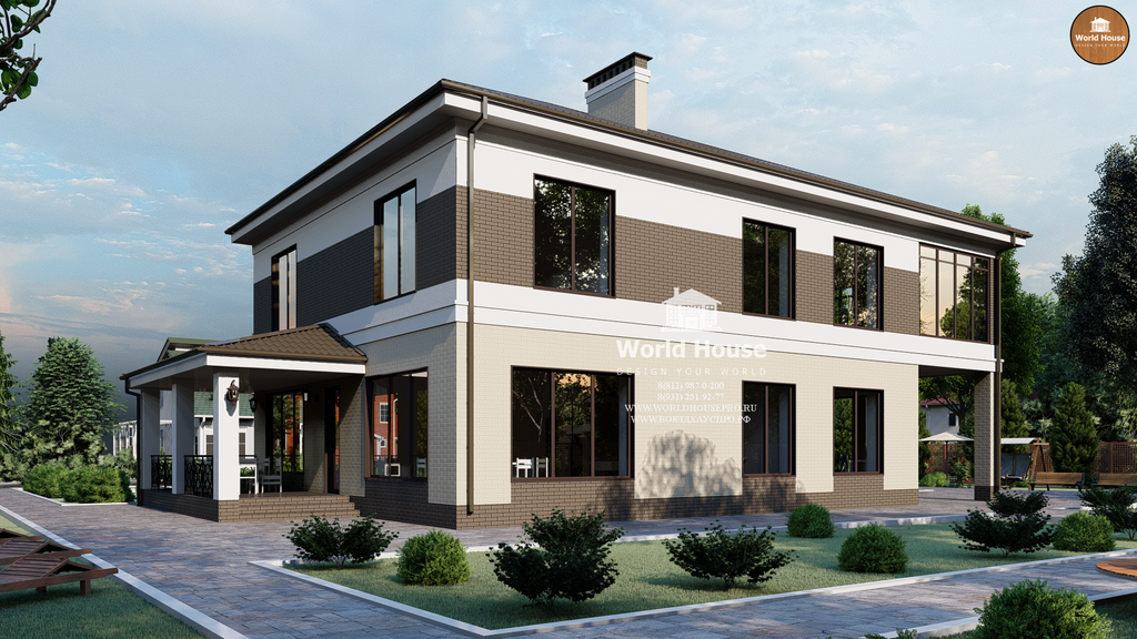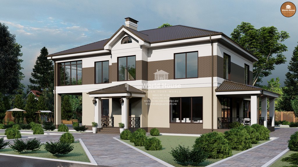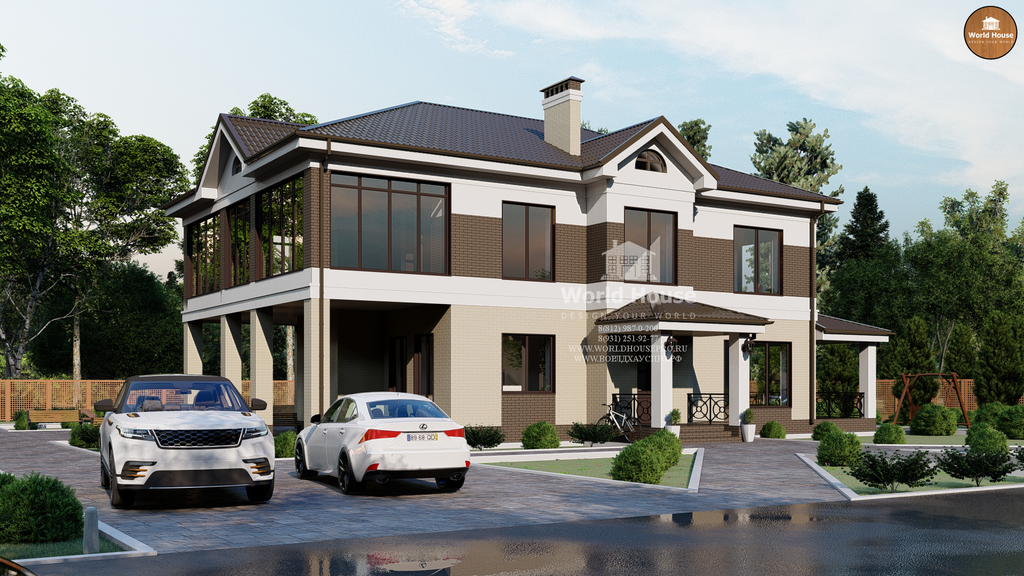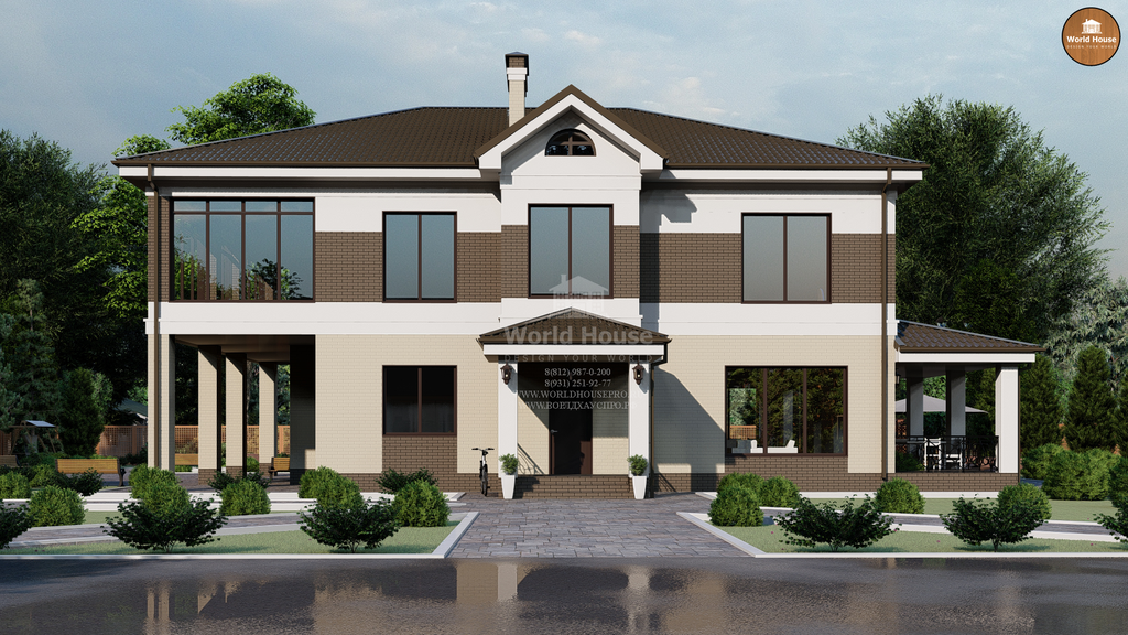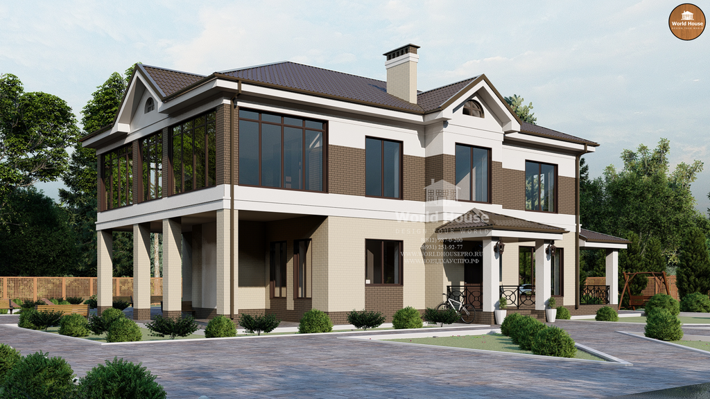 Это большой двухэтажный дом площадью 340м2, стены выполнены из газобетона с облицовкой кирпичом.
