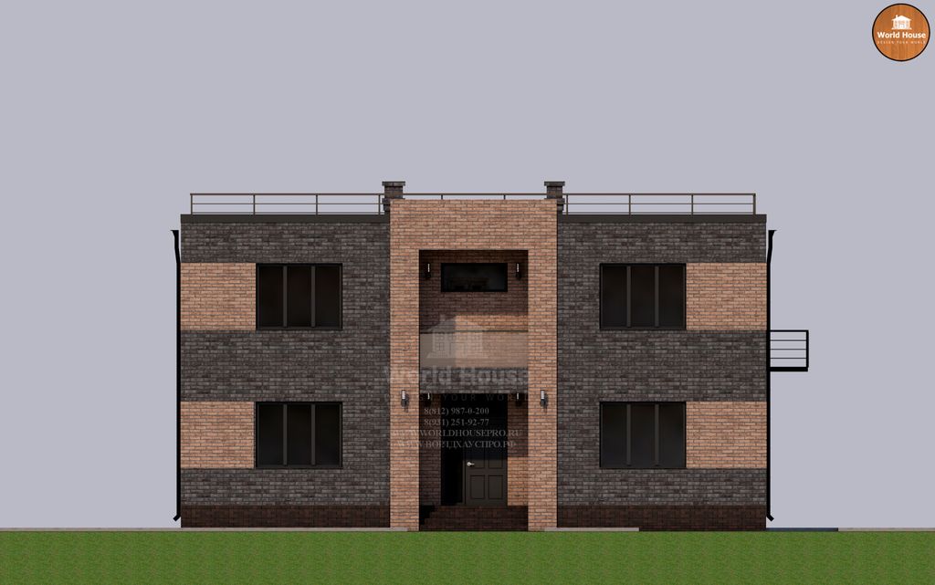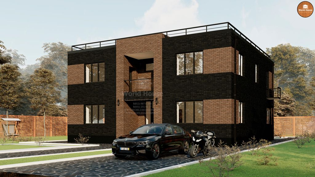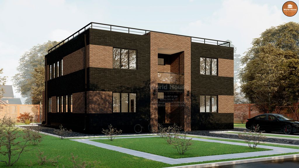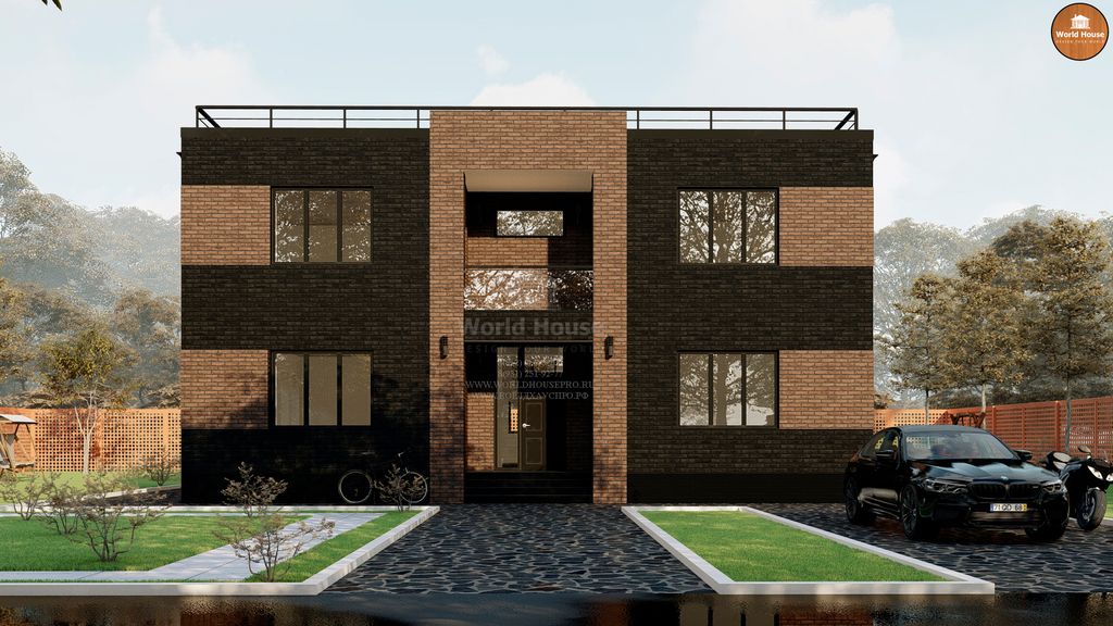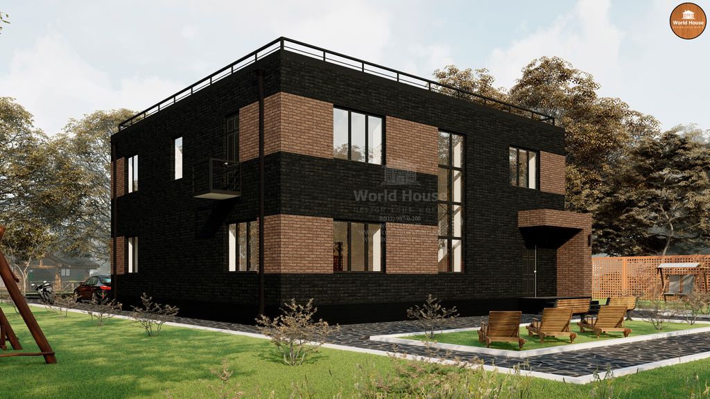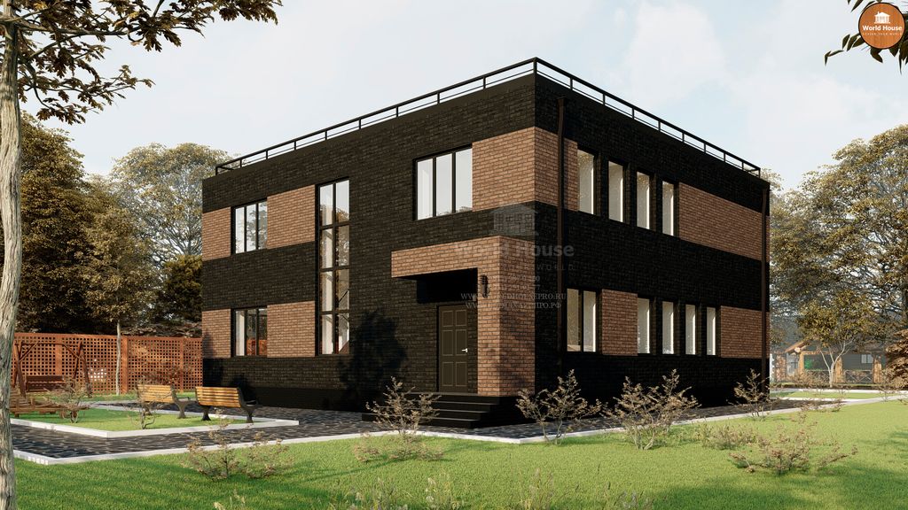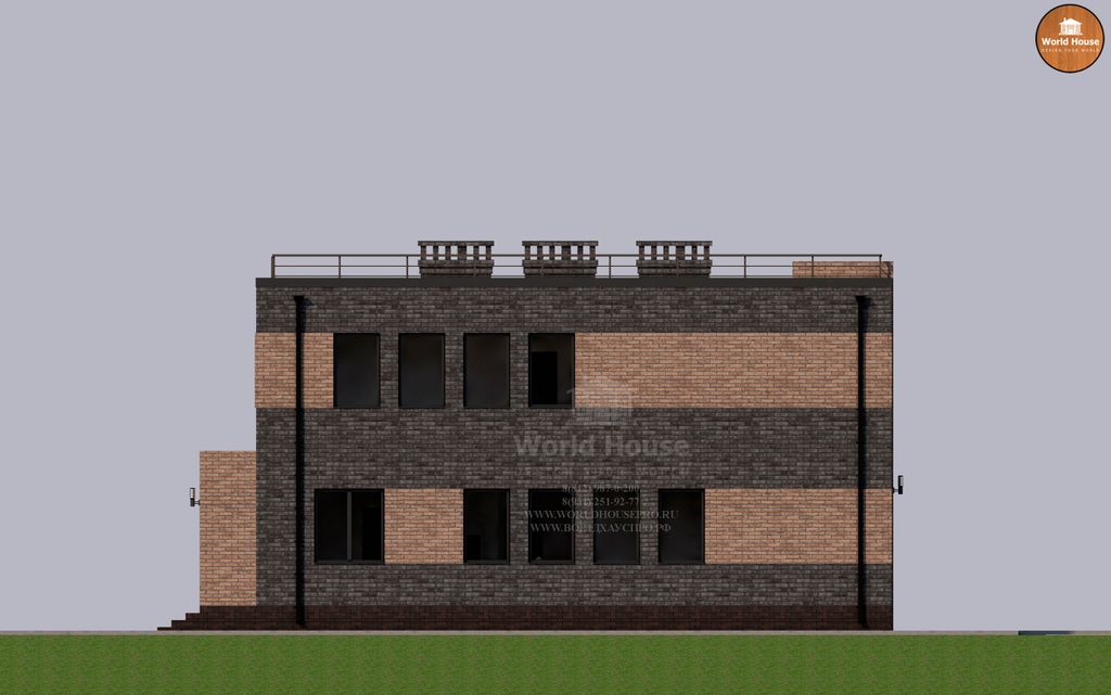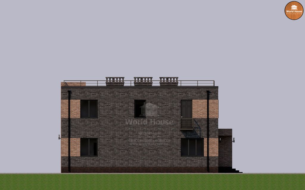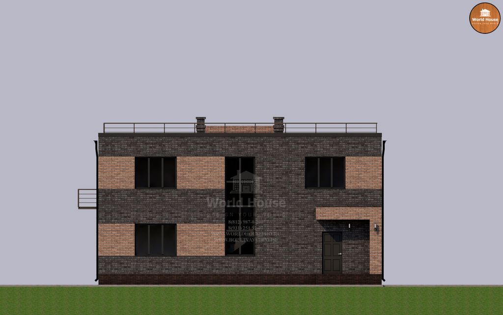 Дом имеет достаточно простые и неброские фасады, Которые выполняются в двух основных цветах, это коричневый и черный кирпич! Достаточно смелое сочетание цветов, так как многим он может показаться мрачным, но в этом есть своя лаконичность и эстетика! На заднем Фасаде имеется интересный навес облицовка которого так-же выполняется из кирпича и выделяется своей простотой! Парапеты плоской кровли обрамлены металлическими ограждениями темного цвета что дает законченную композицию дому!