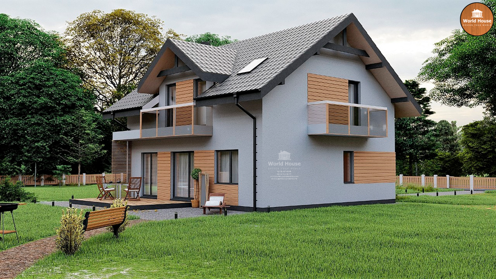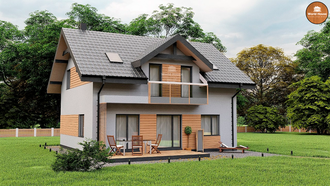 Фасады дома выполнены достаточно скромно, тут нет каких то вычурных деталей. Все очень сдержанно и лаконично.Основной цвет стен светлосерый – это штукатурка по минвате. Второй основной элемент отделки фасада это декоративные панели под дерево. И стекло дополняет этот фасад на ограждения балконов второго этажа. Кровля выполняется в сером цвете из металочерепицы. Под свесом кровли установлены декоративные элементы из дерева окрашеного в серый цвет, которые переключается с серым цветом цоколя!
